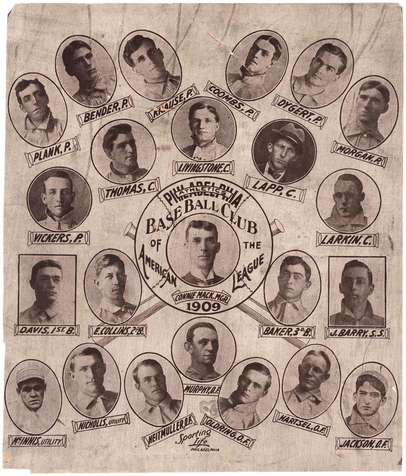 1909 Philadephia Athletics team poster This is a Philadephia Athletics team poster from 1909 featuring Joe Jackson as a utility player (lower right).